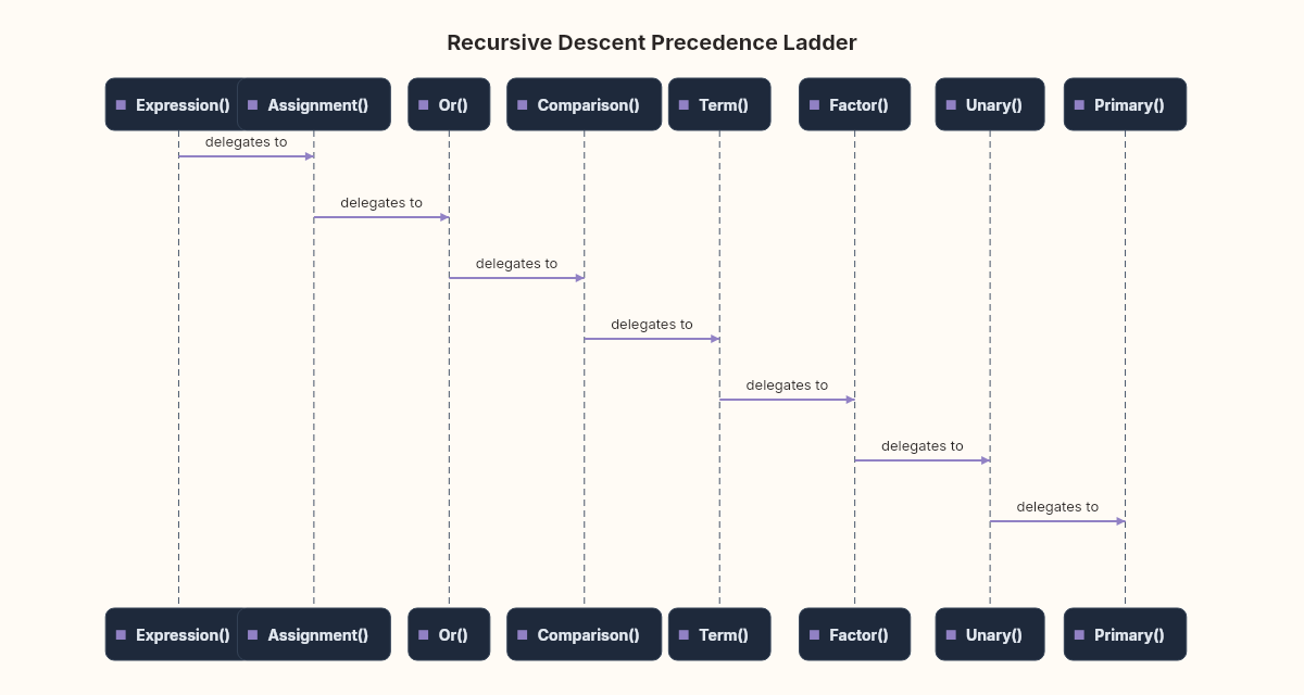 In recursive descent, each level of precedence is a function. The function for addition calls the function for multiplication (which binds tighter). The function for multiplication calls the function for unary operators (tighter still). Unary calls primary (literals, variables, parenthesized expressions — the leaves). Each function is a level in the rhythmic hierarchy, and the recursive calls descend through the levels until they hit the bottom.