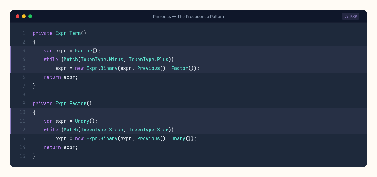 The full parser is about 180 lines of C#. No parser generator, no lookup tables, no grammar file. Just methods calling methods, each one handling one level of the grammar.