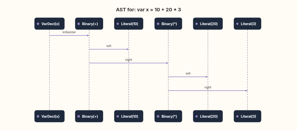 The interpreter will walk the AST, evaluate expressions, execute statements, and manage an environment of variable bindings. var x = 10 + 20 * 3; won't just be a tree — it'll produce 70 and bind it to x. Our language will compute.