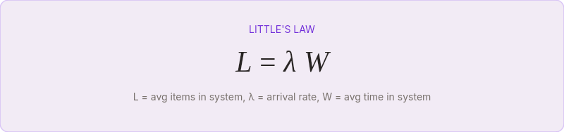 This architecture has a name in mathematics. It's an M/M/1 queue — a single-server queuing system where arrivals are random and service times are random. The foundational result is Little's Law: L = λW