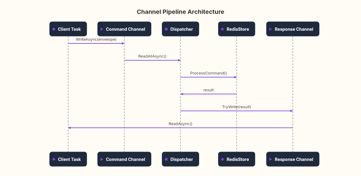 }Now the client tasks do one thing: read from the network, package the command, drop it into the channel, wait for a response. The store is touched by exactly one task — the dispatcher loop. No locks needed. No concurrent dictionary required. The store could be a plain Dictionary<string, RedisValue>.
