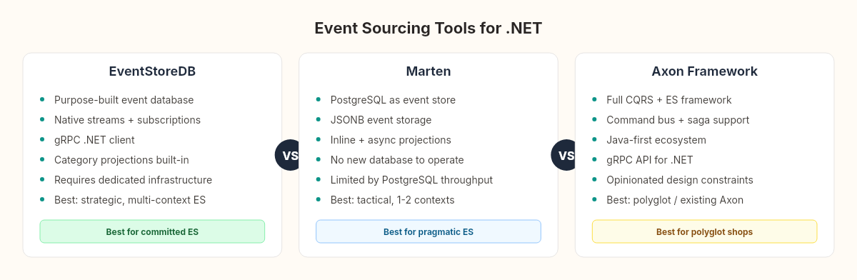 Three tools dominate the .NET event sourcing landscape. Each makes different trade-offs.