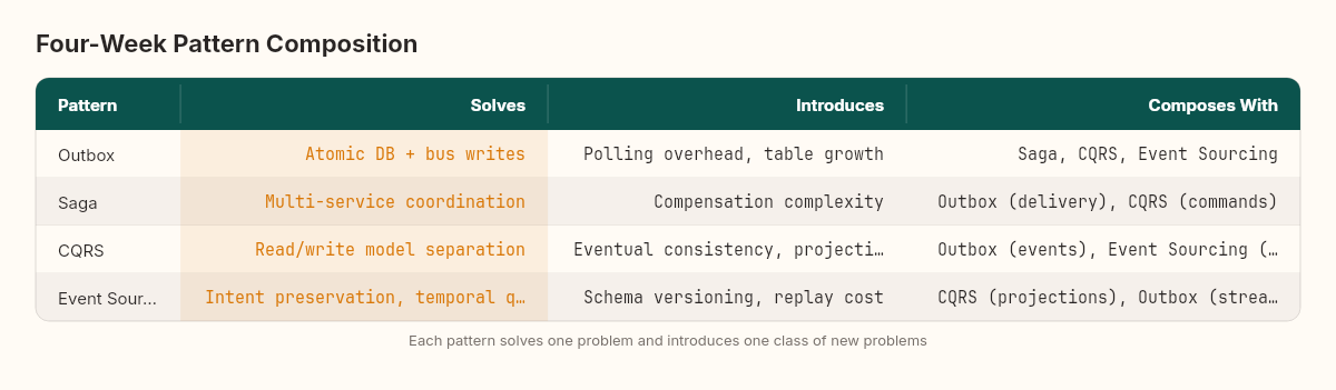 Each layer depends on the one below it. Remove the outbox, and the saga misses events. Remove event sourcing, and the projection can't rebuild from scratch. Remove CQRS, and the command side is fighting the query side for the same database resources. The patterns don't just coexist — they reinforce each other's guarantees.