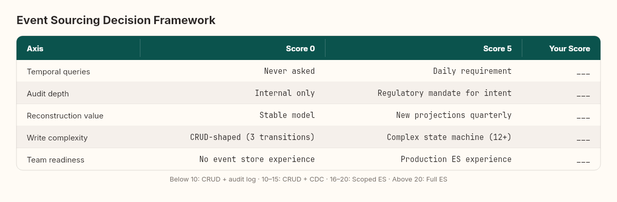 Team readiness: Has your team built and operated an event-sourced system before? This dimension is uncomfortable to score honestly, but it's the one that predicts failure most reliably. Score: 0 (no experience) to 5 (production experience with event stores).