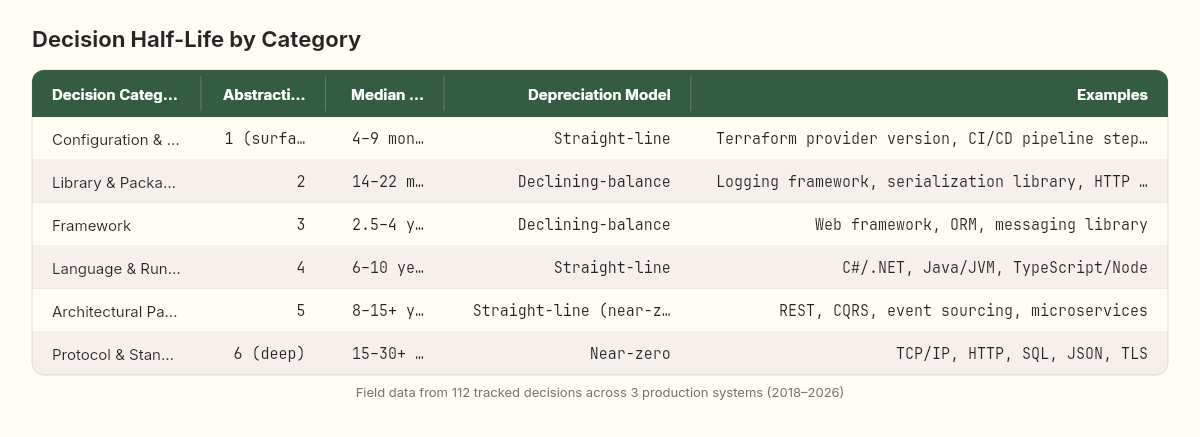 I've found it useful to assign decisions an abstraction depth score from 1 (surface configuration) to 6 (protocol/standard). The half-life roughly doubles with each abstraction level.