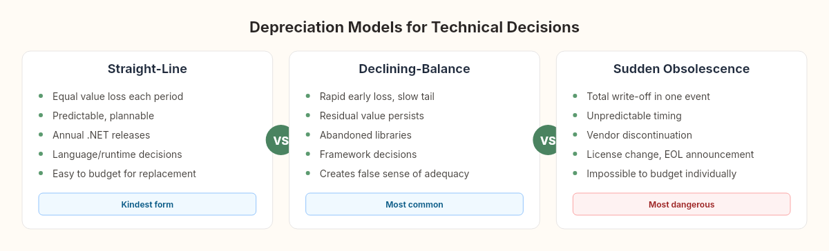 Some technical decisions depreciate this way. A framework that receives steady, predictable updates — each one making the previous version slightly more obsolete — loses value at a roughly constant rate. You can see this in the .NET ecosystem: each annual release makes the previous version one step closer to end-of-support. The depreciation is gradual, visible, and plannable.