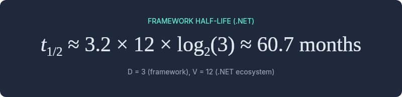 .NET Framework: Growth 2002-2012, maturity 2012-2018, decline 2018-present. Teams that adopted in 2015 (maturity) had about 3 years of remaining useful half-life. Teams that adopted in 2008 (growth) had about 10 years.