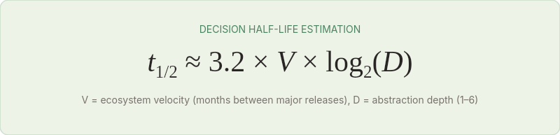 The relationship between ecosystem velocity and decision half-life is roughly inverse-linear. A decision in an ecosystem with 6-month release cycles has approximately half the half-life of the same decision in a 12-month cycle ecosystem.