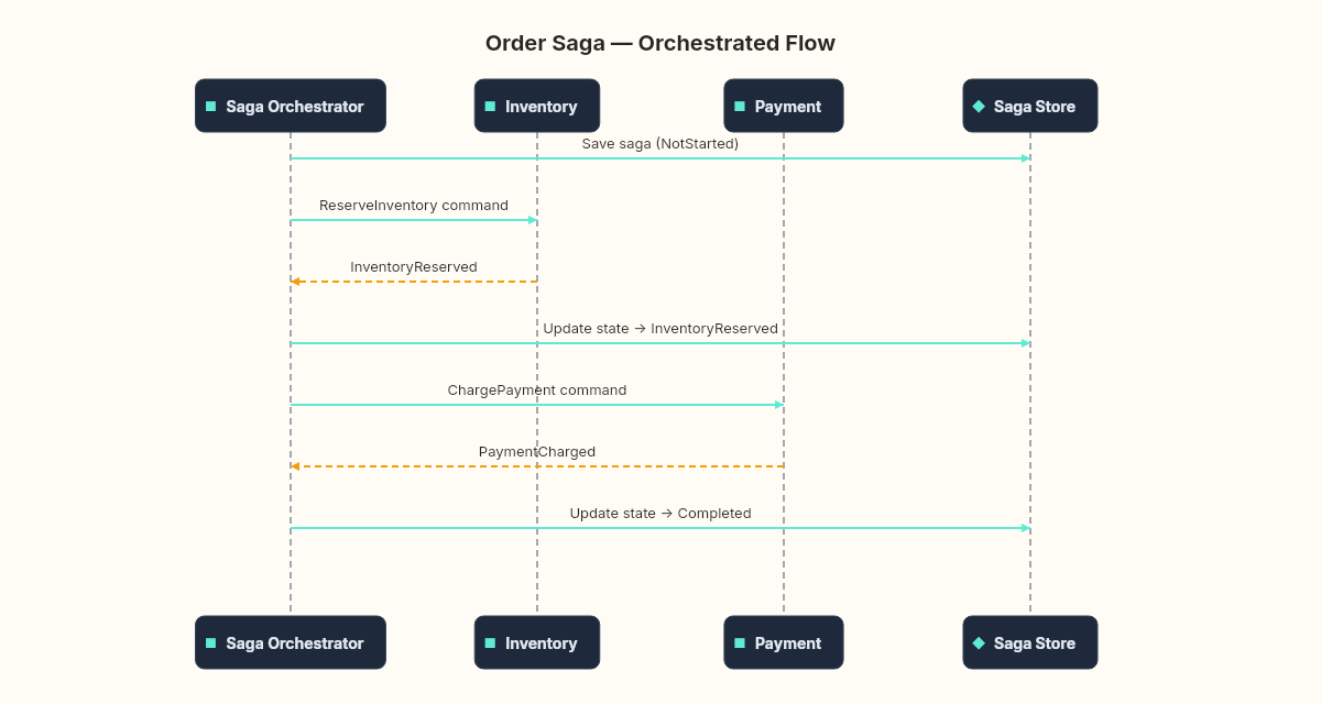 The critical detail: the saga's state is persisted after every transition. If the orchestrator crashes between sending ReserveInventory and receiving InventoryReserved, it can recover by reloading the saga from the database and checking what state it's in. This is where the outbox pattern from earlier in the series connects — the orchestrator uses the outbox to ensure that state changes and message sends are atomic.