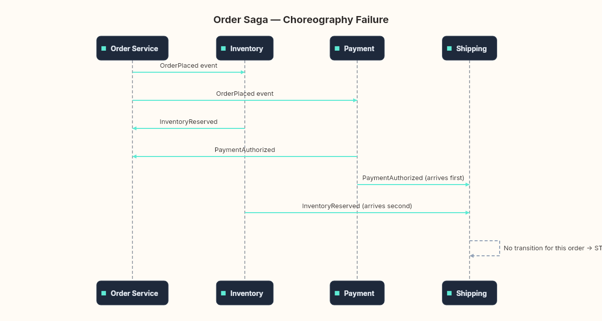 The system was using choreography. No central orchestrator. Each service reacted to events and published its own. The problem was the Order service's state machine. It expected events to arrive in a specific sequence: InventoryReserved first, then PaymentAuthorized. When payment confirmation arrived first — which happened under load because the payment provider's response time was faster than the inventory check — the Order service received an event it didn't have a handler for in its current state.