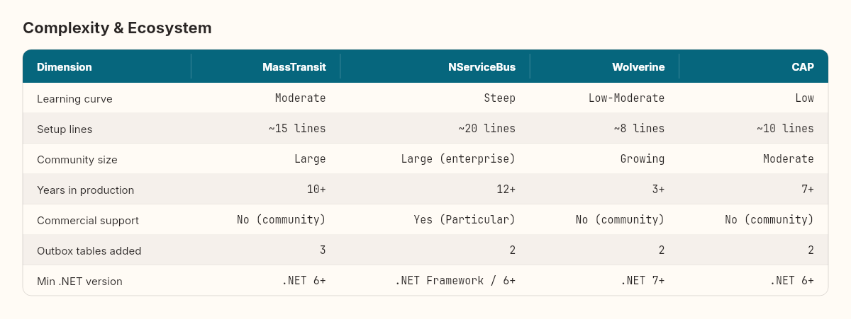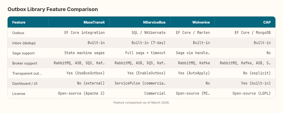 Choose MassTransit when you need a complete messaging framework — consumers, sagas, scheduling, retries — and the outbox is one feature among many. This is the 80% case. Most teams I've worked with end up here, and most are happy.