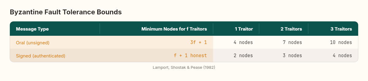 With oral messages — systems where nodes can claim anything without proof — you need 3f + 1 nodes to tolerate f failures. A three-node cluster can't survive even one Byzantine failure. A five-node cluster can survive one. Seven nodes, two failures.