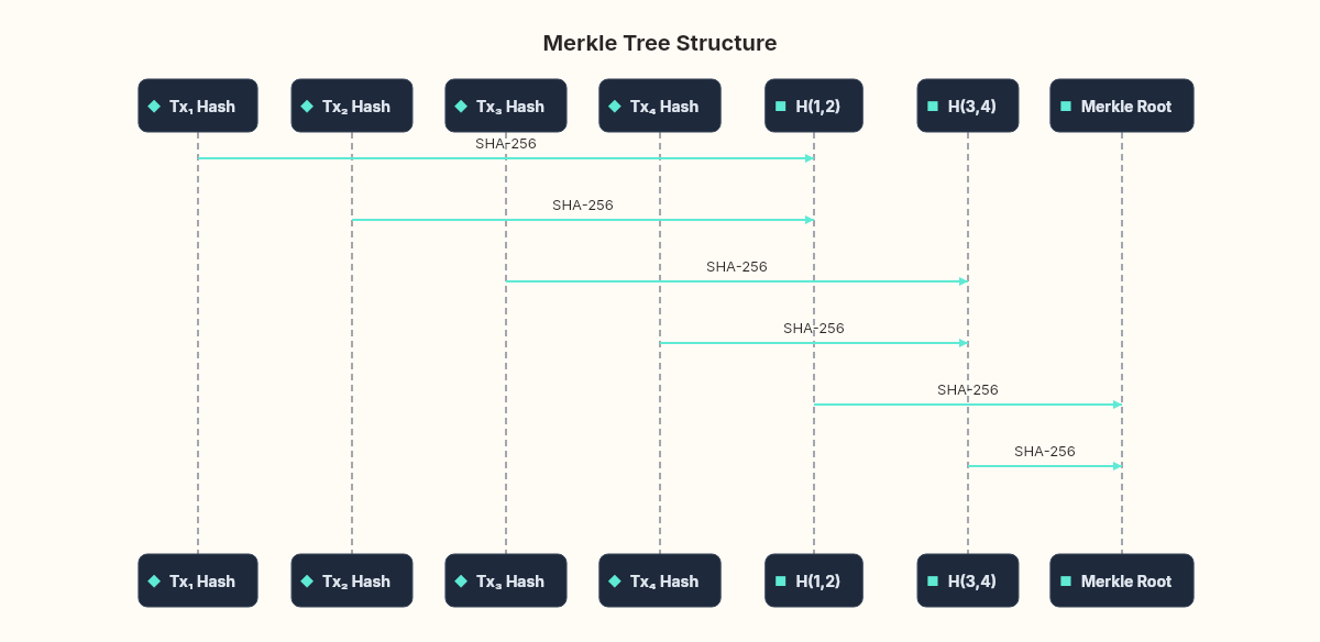This is the structure that connects the individual transactions to the block header. Each block in our blockchain will contain a Merkle root that commits to every transaction in the block. If someone claims "transaction X is in block 47," you can verify that claim with 20 hashes instead of downloading the entire block.