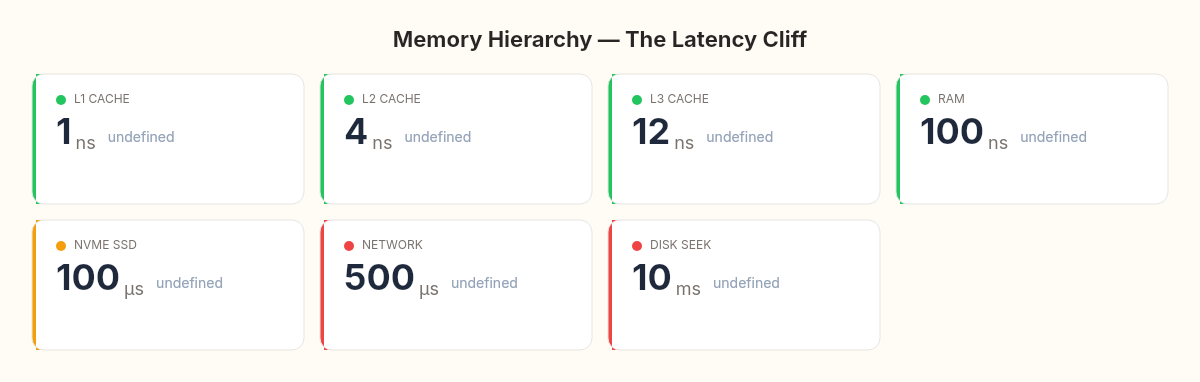 Disk seek: ~10,000,000 ns (10 ms)That's not a linear progression. It's a cliff. The jump from RAM to SSD is a factor of 1,000. The jump from RAM to a network call is a factor of 5,000. The jump from RAM to a spinning disk is a factor of 100,000.