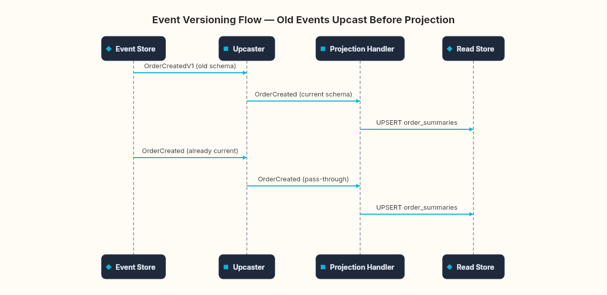 }The upcaster transforms old events into the current schema before the projection handler sees them. The projection handler only needs to understand the latest version. Historical events are upcast on read, not modified in storage.