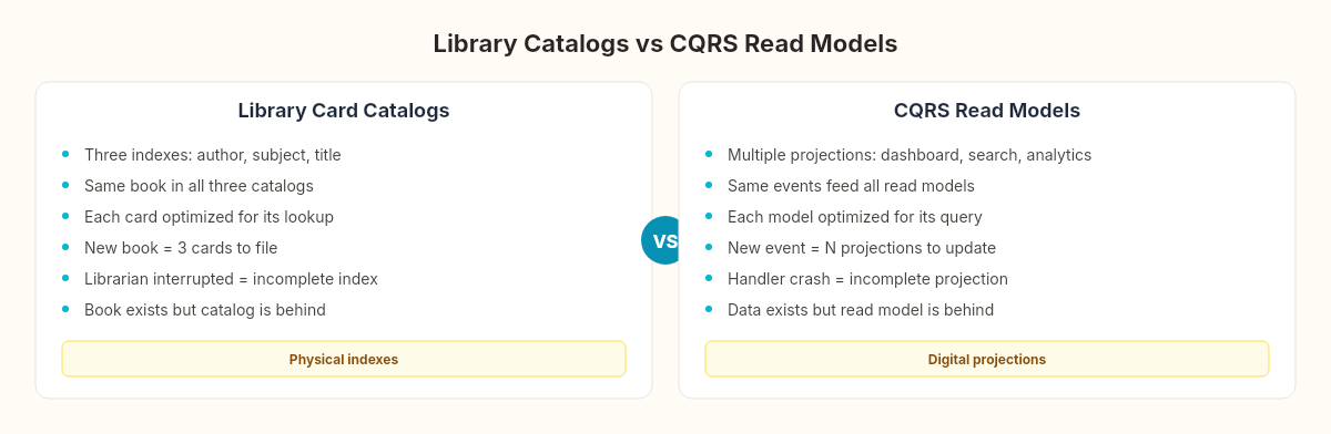 CQRS read models are card catalogs. The write model is the shelf where the book physically sits. The projection handlers are the librarians filing cards. And the five edge cases we're about to examine are the five ways a librarian gets interrupted.