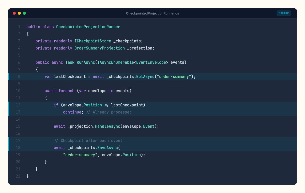}The checkpoint store records the last successfully processed event position. On restart, the handler skips everything before that position. The cost: one extra write per event (or per batch) to the checkpoint store. A small price for crash recovery.