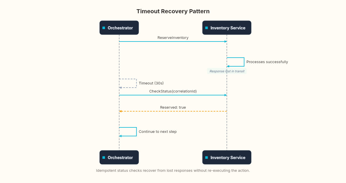 For a failed step, you compensate. For an unknown step, you query. You need a separate "status check" endpoint on each participating service: "Hey, Inventory service — did you reserve items for correlation ID X?" If yes, the step succeeded and the saga can continue. If no, it genuinely failed and you can compensate safely. If the status check itself times out... you're back to compound emergencies.