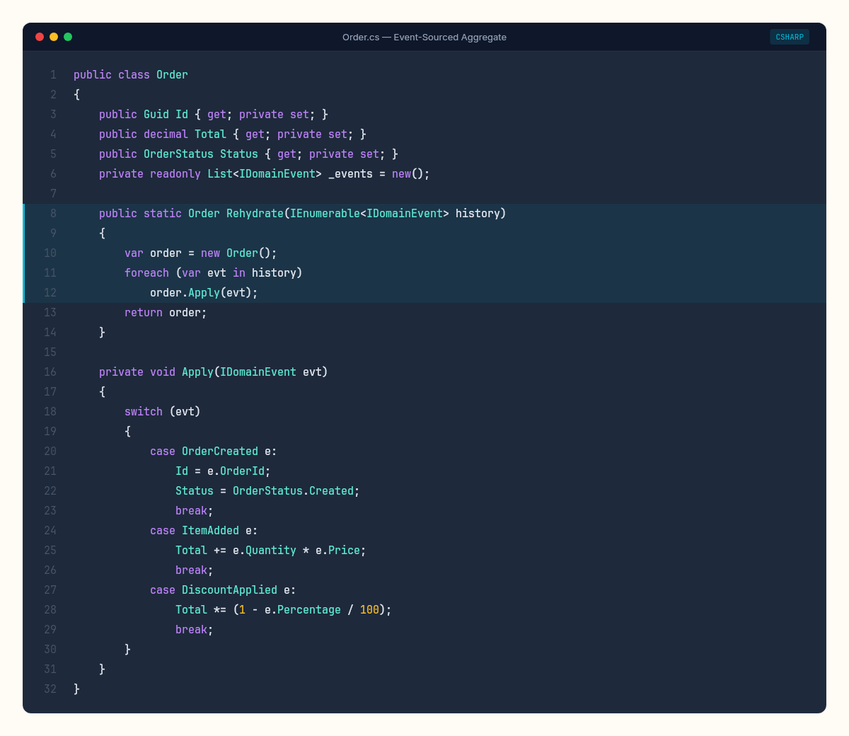 public record OrderCancelled(Guid OrderId, string Reason, DateTime CancelledAt);The current state of Order #4471 is computed by replaying these events in order. Not stored. Computed. The events are the truth. The state is a derivative.