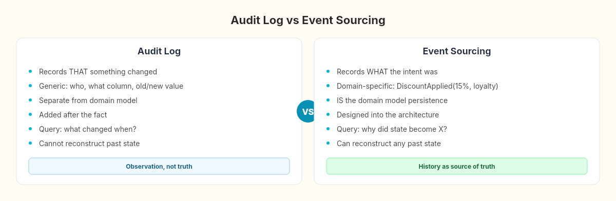 "It's an audit log." An audit log records that something changed. Event sourcing records what the intent was. DiscountApplied(OrderId, 15%, "loyalty program") carries business meaning. An audit row saying total changed from 100 to 85 by system does not. The events are the domain language, not a generic changelog.