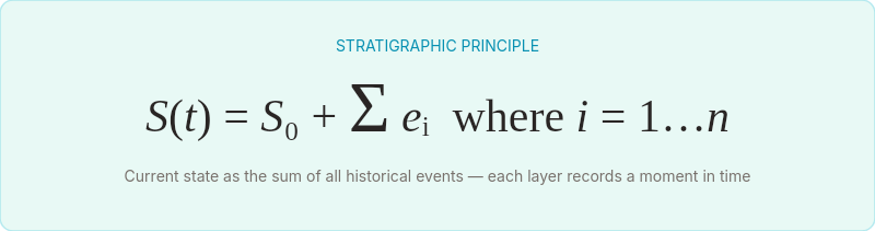 Archaeologists adopted the same principle. When they excavate a site, they don't care about the final state of the ground — the parking lot, the field, the building. They care about the strata: the layers of occupation, destruction, rebuilding, and abandonment stacked on top of each other. Each layer is an event. The sequence of layers is the history.